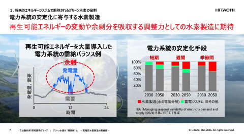 短期・週間・季節間それぞれにおいて電力系統の安定化手段が必要とされている。短期スパンであれば蓄電システムのほうが使い勝手はいいが、長期スパンになればなるほど、電気分解で作られる水素のような手段が安定化に寄与すると期待されている。そこで日立では再生可能エネルギーの変動や余剰分を吸収する調整力としての水素製造システムの開発に取り組んでいる。