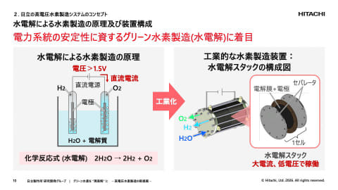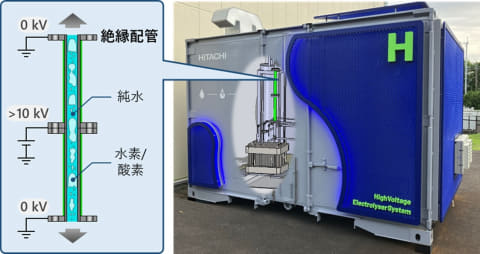 日立では再生可能エネルギー由来の電力で水を電気分解して作る「グリーン水素」(製造時もCO2を排出しない水素)の大量製造に向けたブレークスルーとなり得る技術だとしている。