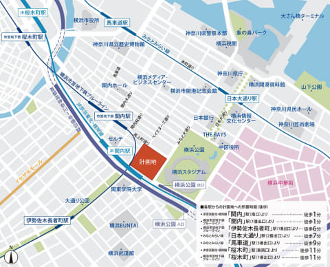 施設は、オフィスメインの「タワー」、ホテルメインの「ザ レガシー(旧横浜市庁舎行政棟)」、ライブビューイング施設の「ザ ライブ(THE LIVE)」、商業の「グリーンウォークテラス」「スタジアムサイドテラス」、観光案内所の「ビジターフロント」で構成される。