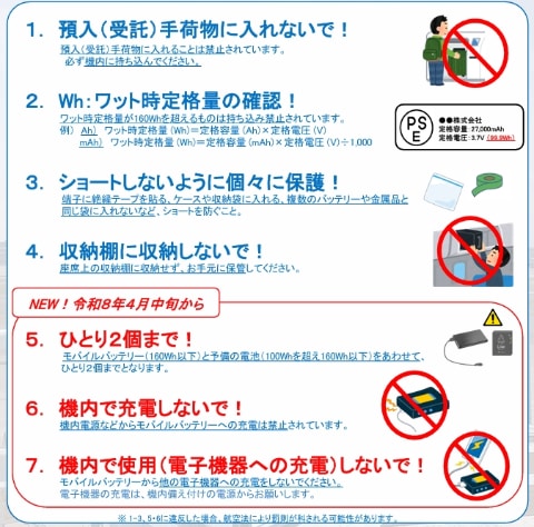 現行基準では、モバイルバッテリーを預け入れ荷物に含めることは禁止されており、機内持込みの個数や容量にも制限が設けられている。今回の改正案はこれらに追加する措置となる。