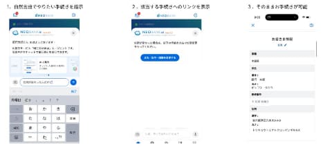 “探さないUI”を目指して開発されたAIアシスタント。「NEOBANK ai」は、「d NEOBANK住信SBIネット銀行アプリ」内で提供され、チャットを通じて、振込や残高確認などの手続きをスムーズに行なえる。複数のメニューを辿ることなく、「〇〇したい」と伝えるだけで、AIが意図を理解し、最適な画面や手順を提示するという。