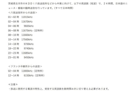 短波放送は日本から直接送信できるため、現地当局の規制を受けにくい。周波数は随時変わり、日本時間14時までの周波数は17560kHz。