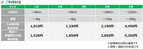 利用可能区間は、東京駅と、新函館北斗駅、新青森駅、盛岡駅、仙台駅、新潟駅、長野駅、金沢駅間。利用料金は3辺合計60cm、重量3kgの1号サイズで、東京=新函館北斗間が1,530円、その他の区間は1,010円。