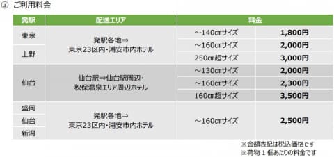 利用区間は、東京駅、上野駅、仙台駅、盛岡駅、新潟駅から対象のホテルまで。利用料金は、東京・上野駅から23区内・浦安市内ホテル宛ての場合、140cmサイズで1,800円など。仙台駅で受け付けた場合のみ、仙台駅周辺と秋保温泉エリアの提携ホテルへも届けることが可能。