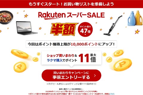 四半期に一度の楽天市場の大規模セール「楽天スーパーSALE」は、3月4日20時から11日1時59分まで開催。時間限定で対象ショップの商品が半額以下となる「半額タイムSALE」やポイント最大47倍などのキャンペーンも展開します。