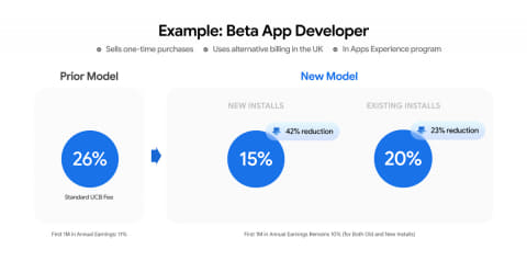 Google Playの手数料も変更・引き下げを行なう。従来は最大30%のサービス手数料が課されていたが、これを決済手数料とサービス手数料に分ける。決済手数料はGoogle Play課金を使用する場合約5%(欧州経済領域(EEA)、英国、米国の場合)となる。