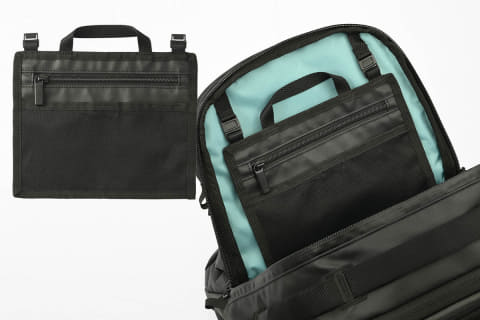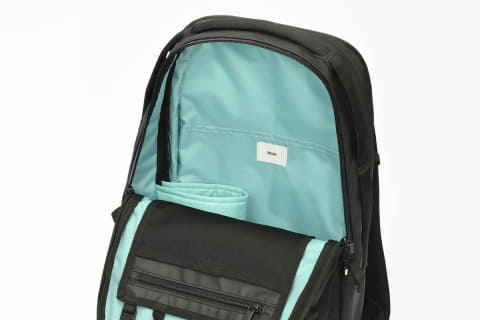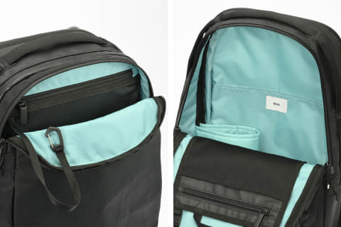内装は、薄暗い場所でも中が見やすいよう、視認性に優れた明るいブルーカラーを採用。収納部は、荷物の仕分けがしやすい2気室構造とした。PC収納部は背胴側に独立した形で設置し、内装は柔らかなパイル生地を使用している。