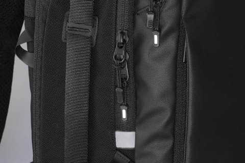 夜間の安全性を高めるため、光を反射する「リフレクター」をファスナー引手など各所に配置。バッグをコの字型に囲むような、天面と左右側面の計5カ所の「ハンドル」デザインを採用した。