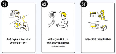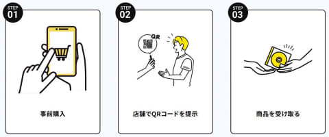公演グッズなどをオンラインで事前購入し、会場ではQRコードを提示するだけで受け取れるサービス。このほか、会場で商品を予約し、自宅配送・HMV店頭で受け取ることもできる。イベント会場だけでなく、事前購入した新譜のHMV店舗受け取りサービスにも対応する。