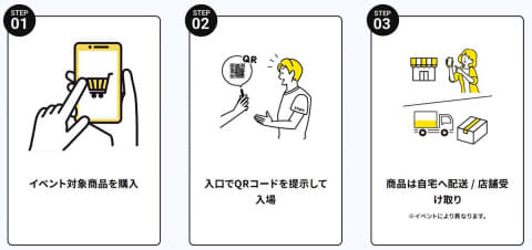 対象商品を購入するとイベントに参加できるキャンペーンなどにも対応する。イベント対象商品を購入し、イベントの入口でQRコードを提示することで入場できるといった仕様。購入した商品は自宅へ配送のほか、HMV店舗でも受け取れる。