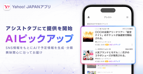 LINEヤフーは、「Yahoo! JAPAN」アプリにおいて、ユーザーがフォローしているテーマに関連した予定や情報をAIがピックアップして教えてくれる機能「AIピックアップ」の提供を開始した。「アシスト」タブで表示される。