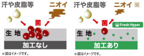 不快なニオイ成分は汗や皮脂を菌が分解することで発生する。同製品ではニオイの元となる菌の増殖を抑制する抗菌防臭機能「Fresh Hyper」により、ニオイの元となる菌の増殖を抑える。