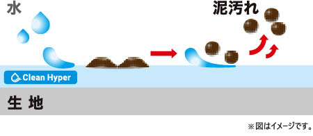 黄ばみの発生は、洗濯で落としきれなかった汗や皮脂汚れが酸化することが原因。これに対し、防汚性に優れた機能「Clean Hyper」により、生地の親水性が良く、洗濯する際に水が生地と皮脂汚れの隙間に入り込むことで、皮脂汚れを浮かし落ちやすくなり、黄ばみを抑制するという。