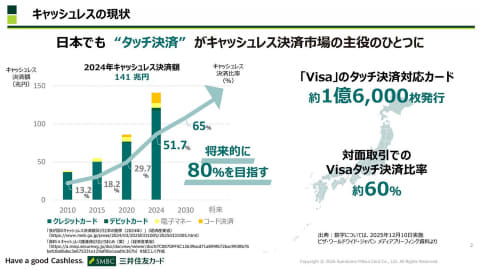 また、クレジットの「タッチ決済」の普及が進み、Visaだけでも1億6,000万枚のタッチ決済対応カードが発行され、対面取引でのタッチ決済比率は60%となっており、三井住友カードに限定すれば「70%を超えている」という。