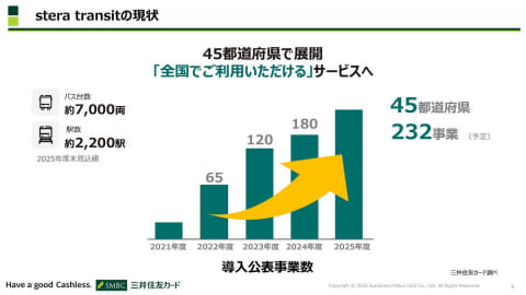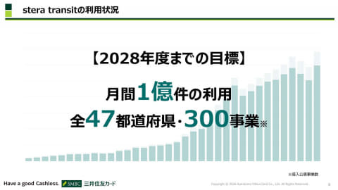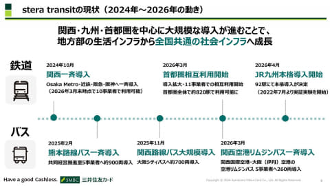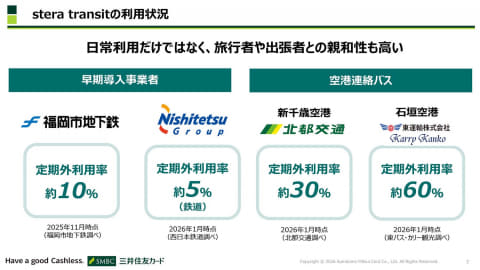 Vポイント付与は、関西・九州の一部事業者で採用が決まっているほか、首都圏でもゆりかもめなどで検討中で、「2026年度は10社以上に拡大したい」(三井住友カード Transit本部長 兼 Transit事業企画部長 石塚 雅敏氏)とした。