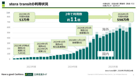 2026年2月のstera transit月間利用件数は598万件。3年前との比較では11倍に拡大している。