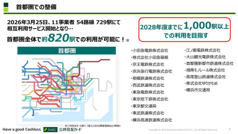 3月25日からスタートする首都圏の相互利用については、11事業者54路線729駅にて相互利用サービスが開始され、すでに投入済みの横浜市営地下鉄やゆりかもめとあわせて約820駅に対応。2028年度まで1,000駅を目指すとした。