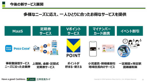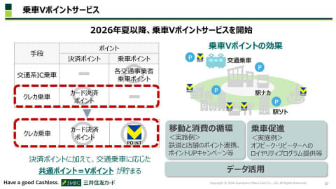 また、乗車に応じたVポイント付与サービスも計画。電車やバスに「クレカ乗車」することで、Vポイントが貯まるというもので、利用者にとってはお得で、事業者にとってはデータ連携による移動と消費の循環が図れるとする。