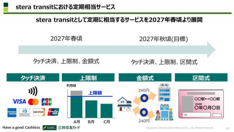 定期券については定期に相当するサービスを2027年春頃より展開。まずはタッチ決済で上限制のサービスを27年春に開始し、27年秋ごろに一般的な定期券に近い「区間式」に対応する。また通学定期対応も予定している。定期券は特に導入済みの公共交通機関からのニーズの高い機能で、早期の実現を目指すとした。