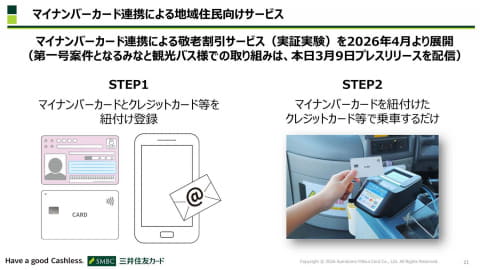 マイナンバーカード連携による地域住民向けサービス予定。第1弾として、神戸市の「みなと観光バス」で70歳以上の人を対象に実証実験を行ない、マイナンバーカードと連携して、自動的に敬老割引サービスが適用されるようにする。これにより、利用者負担の削減のほか、事業者にとっても敬老割引サービス専用カードの発行や窓口での手続きが不要となるなどのメリットを創出していく。