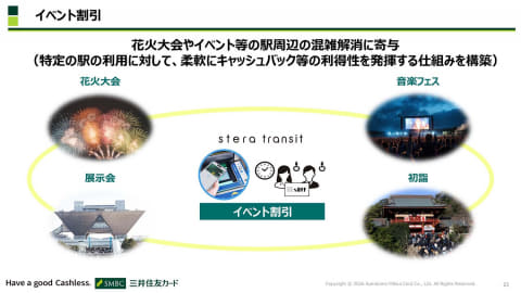 イベント割引は、花火大会やイベント等の駅周辺の混雑解消を目的としたもので、特定の日時の駅の利用に対して、クレカ乗車でキャッシュバック等のお得感を発揮する仕組み。花火大会当日の切符売り場混雑などに対し、クレカ乗車を使うことで、一定の割引を行なうなどで、混雑緩和を目指すもの。26年度は複数の花火大会で導入予定としている。