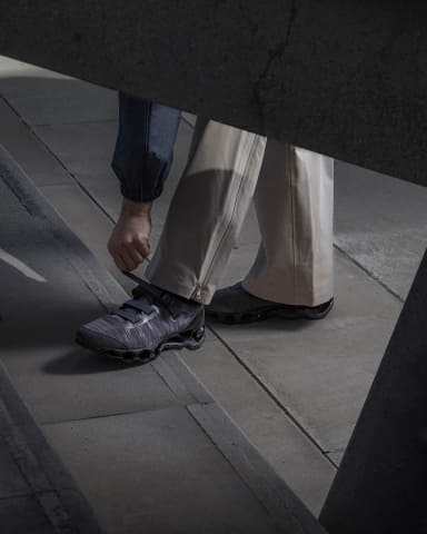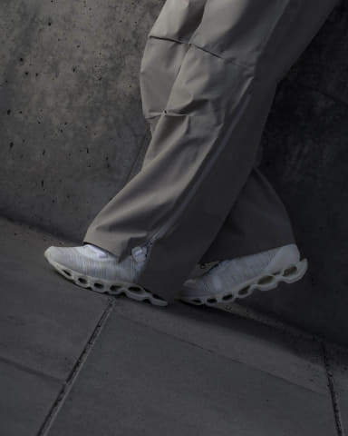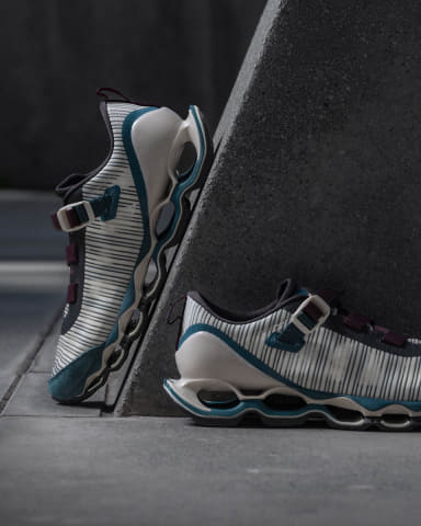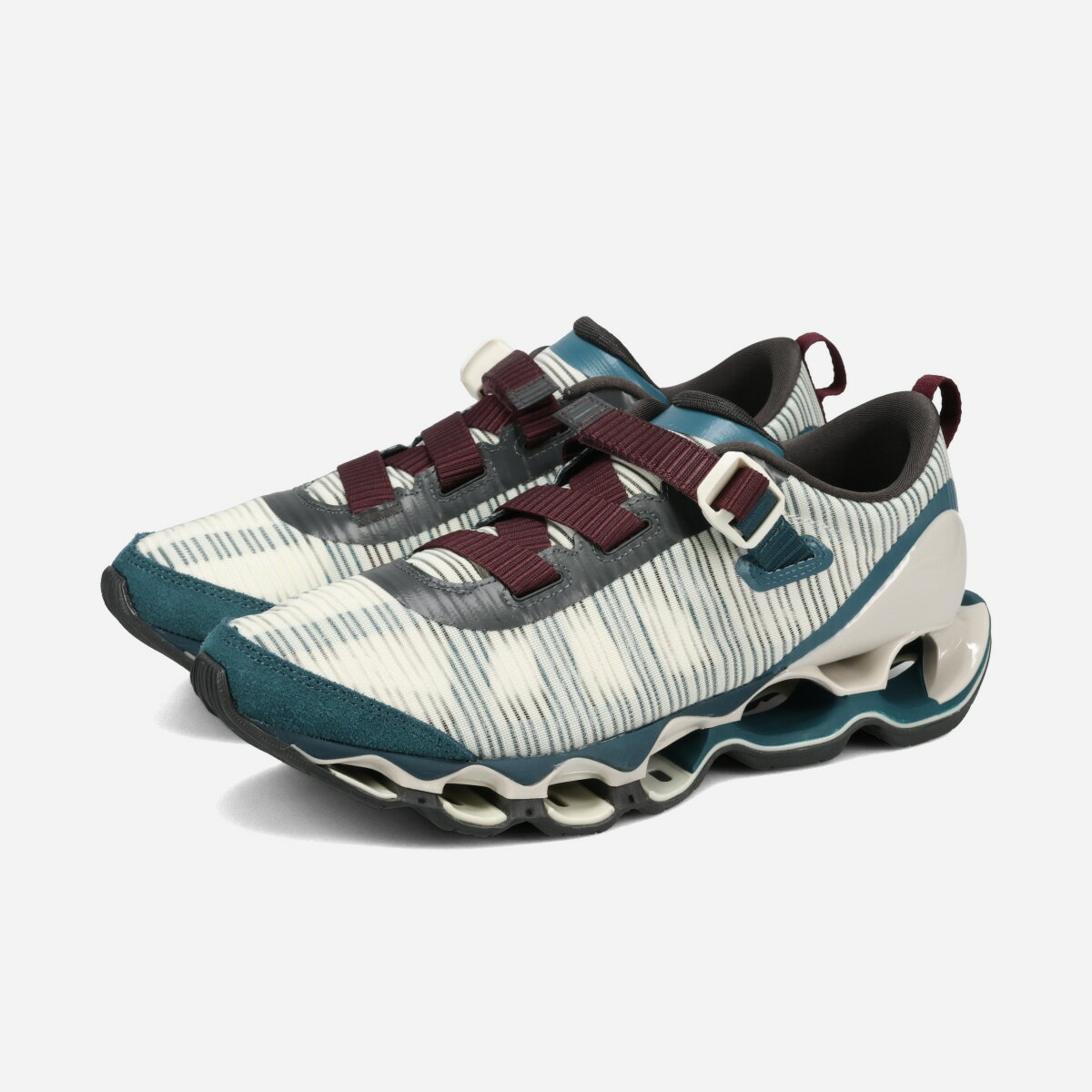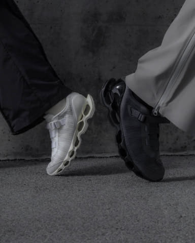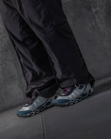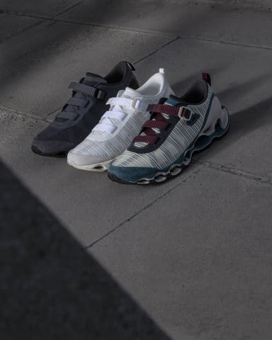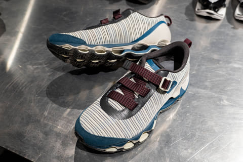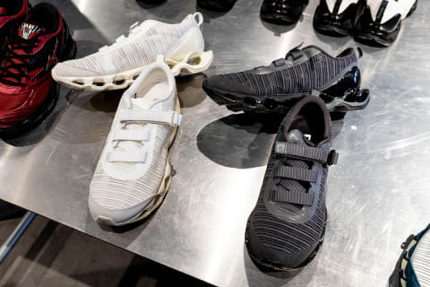 初代 「WAVE PROPHECY STRAP」は、スプリントスパイクから着想した“締めるべきポイントだけを確実に締め上げる”ストラップのワンアクション構造と、微調整用アジャストテープを備えた設計で、都市生活における着脱のしやすさと履き心地を両立した。今回のバージョン2では初代の構造に加えて、最新スプリントスパイクのアッパー構造をベースに、アッパーの耐久性とホールド性を保ちながら、軽量で通気性のある構造となっている。