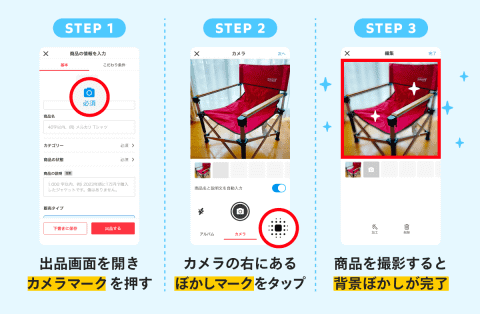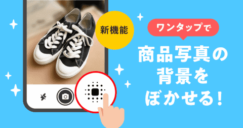 AIが商品の輪郭を認識し、出品時に撮影した商品写真の背景をぼかせる機能。カメラの右にあるぼかしマークをタップすることで適用され、撮影すると背景ぼかしが完了する。背景ぼかしを一度オンにすると設定は次回の出品にも引き継がれ、撮影画面でオン/オフを切り替えられる。