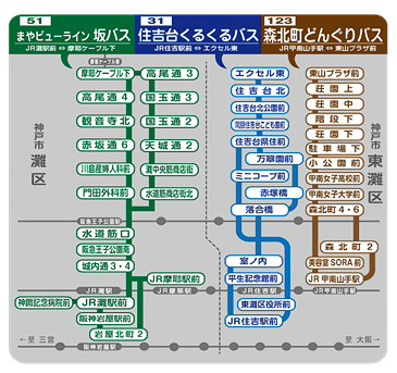 対象路線は、坂バス(51系統)、住吉台くるくるバス(31系統)、森北町どんぐりバス(123系統)の3路線。対応ブランドはVisa、Mastercard、JCB、American Express、Diners Club、Discover、銀聯。