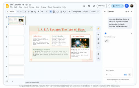 Google スライドでは、Geminiがレイアウト、編集可能な図表、プレゼンテーション全体をゼロから生成する。