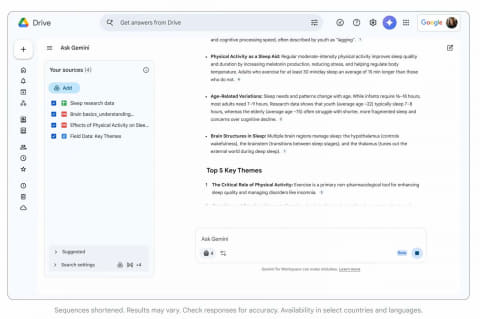 また、ドライブでGeminiに質問(Ask Gemini in Drive)では、Google ドキュメントやメール、カレンダー、Webを横断した複雑な質問が可能となる。例えば、税務関連ファイルを全て選択し「今年の確定申告前に税理士に何を聞くべきか?」と尋ねれば、実際のデータに基づいた回答を得られるという。研究論文の準備やグループプロジェクトの整理などに役立てられるとする。