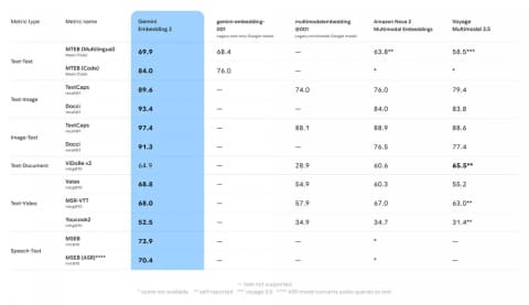 GoogleはGemini Embedding 2について、従来モデルの改良にとどまらず、マルチモーダル領域で新たな性能水準を打ち立てるモデルと位置付ける。強力な音声認識機能を備えるほか、テキスト、画像、動画の各タスクで高い性能を発揮し、多様な埋め込みニーズに対応できるとしている。