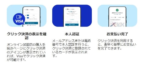 Visaのクリック決済は、ECサイト上におけるクレジットカード番号の入力の手間をなくし、対面でのタッチ決済のように利用できる決済方式。国際標準仕様「Secure Remote Commerce」に基づいている。