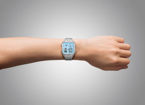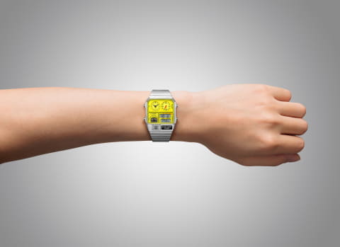 「JG2170-59Y」は36,300円で限定500本。温度計を備えた「アナデジテンプ」のデザイン復刻モデルで、ケース・ブレスレットがともにステンレススチール製のフルメタル仕様がベースになっている。電池駆動のクオーツ式。本体サイズはケース径が32.5mm、厚さが8mm。
