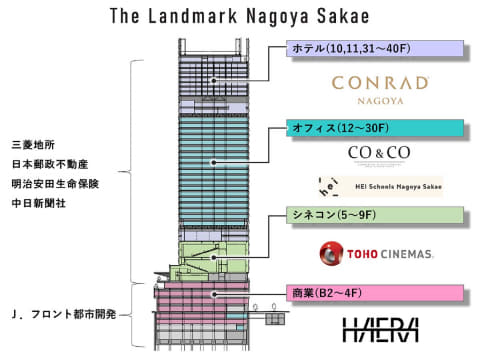 地下2階~地上4階が商業施設「HAERA(ハエラ)」、5階~9階がシネコン「TOHOシネマズ 名古屋栄」、12階~30階がオフィス、10・11・31~40階がホテルとなる。ホテルの開業日は決定次第発表される。
