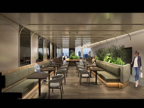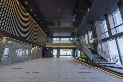 12階のオフィスエントランスは、3層吹き抜けの開放的な空間に大階段を配したスカイロビーを設けた。栄の眺望が広がるダイナミックな空間となり、同階にはタリーズコーヒーとローソンの入居が決定している。オフィスフロアからは名古屋城や名駅エリアのビル群、久屋大通公園を見渡せる。13階と14階にはオフィス就業者専用ラウンジを備える。