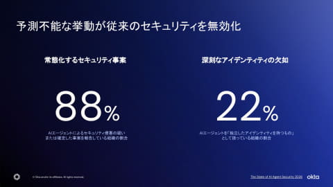 AIエージェントの活用が広がるなか、その自律的かつ予測しにくい振る舞いが従来のセキュリティモデルでは十分に対応しきれない課題になっている。過去6カ月間でAIセキュリティを巡るリスクは増大しており、最近の調査では88%の組織がAIエージェントによるセキュリティ侵害の疑い、または確定した事案を報告しているという。