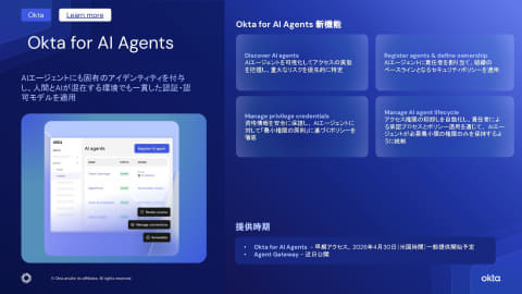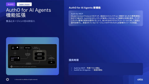 Okta for AI Agentsは早期アクセスとして提供中で、4月30日(米国時間)から一般提供を開始する。Auth0 for AI Agentsの新機能「Auth for MCP」も早期アクセスを開始している。