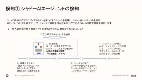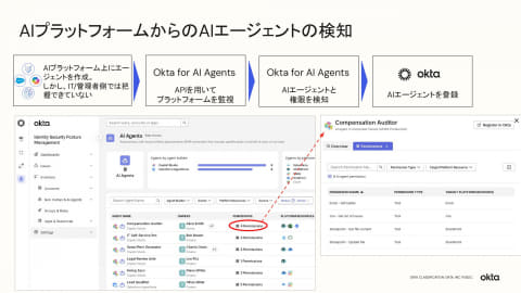 「登録」段階では、検知したAIエージェントを「Universal Directory」に独立したアイデンティティとして登録し、人間の責任者(オーナー)を割り当てる。これによりAIエージェントが「誰の代わりに」「どのリソースへ」「どの権限で」アクセスするのかを一元的に管理し、監査やガバナンスの基盤を整える。