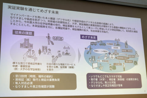 大学における在学証明書の発行は、窓口対応による時間・場所の制約があるほか、紙の発行の手間が発生し、なりすまし対策なども必要とされる。これに対し、マイナンバーカードとデジタル認証アプリによる本人確認により、申請をスマホからデジタルで行なえるようにすることで、大学側の業務負担削減を図る。あわせて、利用者にとってもデジタルでいつでも証明書取得できるほか、なりすましを防ぎやすい仕組みとしていく。