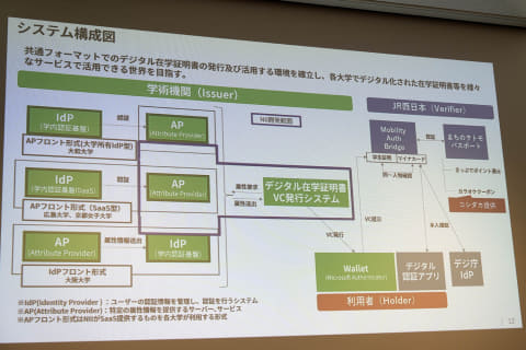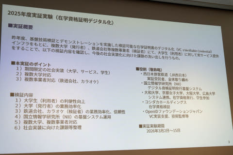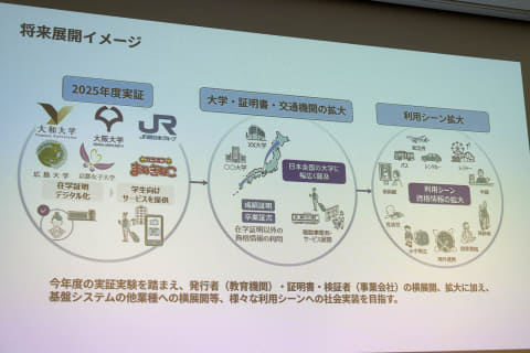 2024年度にも大学と在学証明書、交通機関(JR西日本)における連携の技術検証を行なったが、2025年度は複数の大学に広げて、交通機関以外にも拡大した。