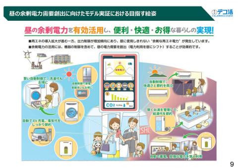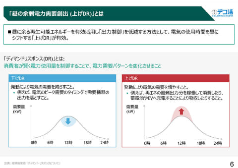 昼に余る再生可能エネルギーを有効活用し「出力制御」を低減するため、昼間の電力需要創出を目指す取り組み。消費者が電力使用量を制御することで電力需要パターンを変化させることを意味する「DR(ディマンドリスポンス)」のうち、電気の使用時間を昼にシフトする「上げDR」が有効であるという考えから実施した。