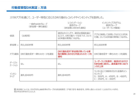 行動変容型DRに関しては、Looopが提供するスマホアプリを通じて、ユーザー特性に応じたDR行動のレコメンドやインセンティブを提供。参加者に対してDR行動を促すメッセージを通知することは共通だが、内容は2パターンで、「一律のメッセージ」「参加者が持っている家電の種類に合わせた内容」を用意した。