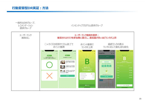 参加者は3つのグループに分類し、上記2パターンを通知する2つのグループのほか、「一律のメッセージ」に加えてタスク達成による金銭的インセンティブを設定したグループを設け、計3つのグループを比較検証した。参加世帯は各3,000世帯、計約9,000世帯。