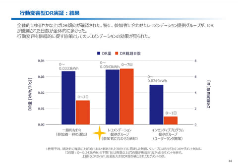 行動変容型DR実証の結果、全体的にゆるやかな上げDR傾向を確認。特に、参加者に合わせたレコメンデーション提供グループが、DRが観測された日数が全体的に多く、行動変容を継続的に促す施策としてのレコメンデーションの効果が見られた。