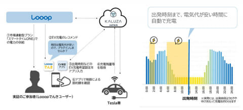 EV制御の方法は、参加者が実証用アプリで設定した出発時刻と充電上限を取得し、実証システムがEV充電計画を作成。出発時刻に間に合う範囲、かつ最も電気代が安くなるように、充電上限まで遠隔操作で自動的にEV充電を行なった。実証にあたってはKaluza Japanと協働している。