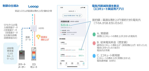 エコキュート制御の方法は、参加者の生活リズムから電気の使い方・お湯の使い方を取得し、実証システムが沸き上げ計画を作成。湯切れを起こさない範囲、かつ最も電気代が安くなるように、自宅の太陽光発電の余剰電力も考慮して、自動的にエコキュート沸き上げを行なった。加えて、消費電力を5分間隔で監視し、家庭内の消費電力と沸き上げに必要な電力を合算した値が契約電力を超えると判断した場合には、当該コマの沸き上げを中止し再計画する運用とした。
