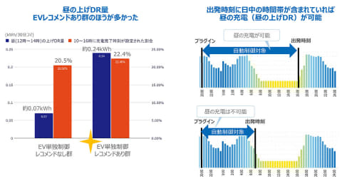 機器制御型DR実証の結果、EVレコメンドあり群のほうが、昼の上げDR量が多く確認された。かつ、出発時刻を日中の時間帯に設定する割合が高く、レコメンデーションが昼間の上げDRに貢献した可能性があるとしている。一方で、EVレコメンドあり群において、レコメンド配信日の充電のためのプラグインが増加する傾向は見られなかった。