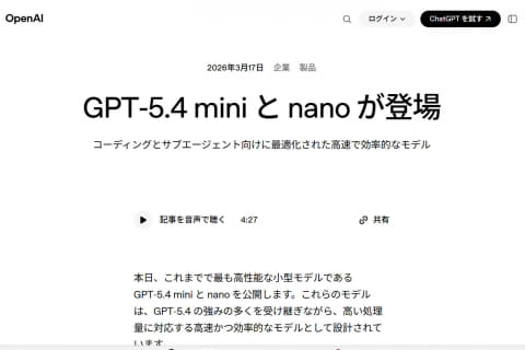 OpenAIは18日、高性能な小型モデル「GPT‑5.4 mini」と「GPT-5.4 nano」を公開した。いずれもコストを抑えながら、高い応答性が特徴で、nanoはもっとも速度とコストが重視されるタスク向けとなる。