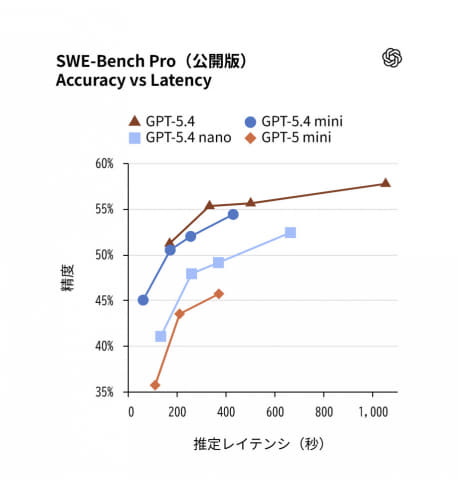 GPT‑5.4 miniは、コーディング、推論、マルチモーダル理解、ツール利用などの分野でGPT‑5 miniから大きく性能を向上。動作速度も2倍以上高速化している。SWE-Bench ProやOSWorld-Verifiedなどのベンチマークでは、GPT‑5.4 モデルに匹敵するパフォーマンスを示しているという。