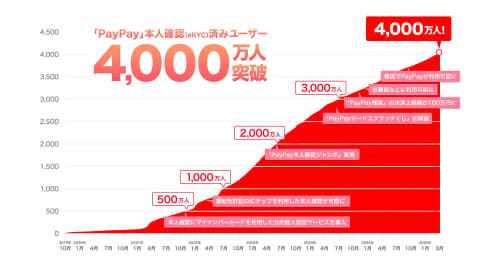 なお、PayPayアプリへ口座を登録する場合、PayPayアプリでの本人確認(マイナンバーカードや運転免許証によるeKYC)が必要となる。PayPayの7,300万ユーザーのうち、本人確認を完了したユーザーが、4,000万人を突破したことも発表している。